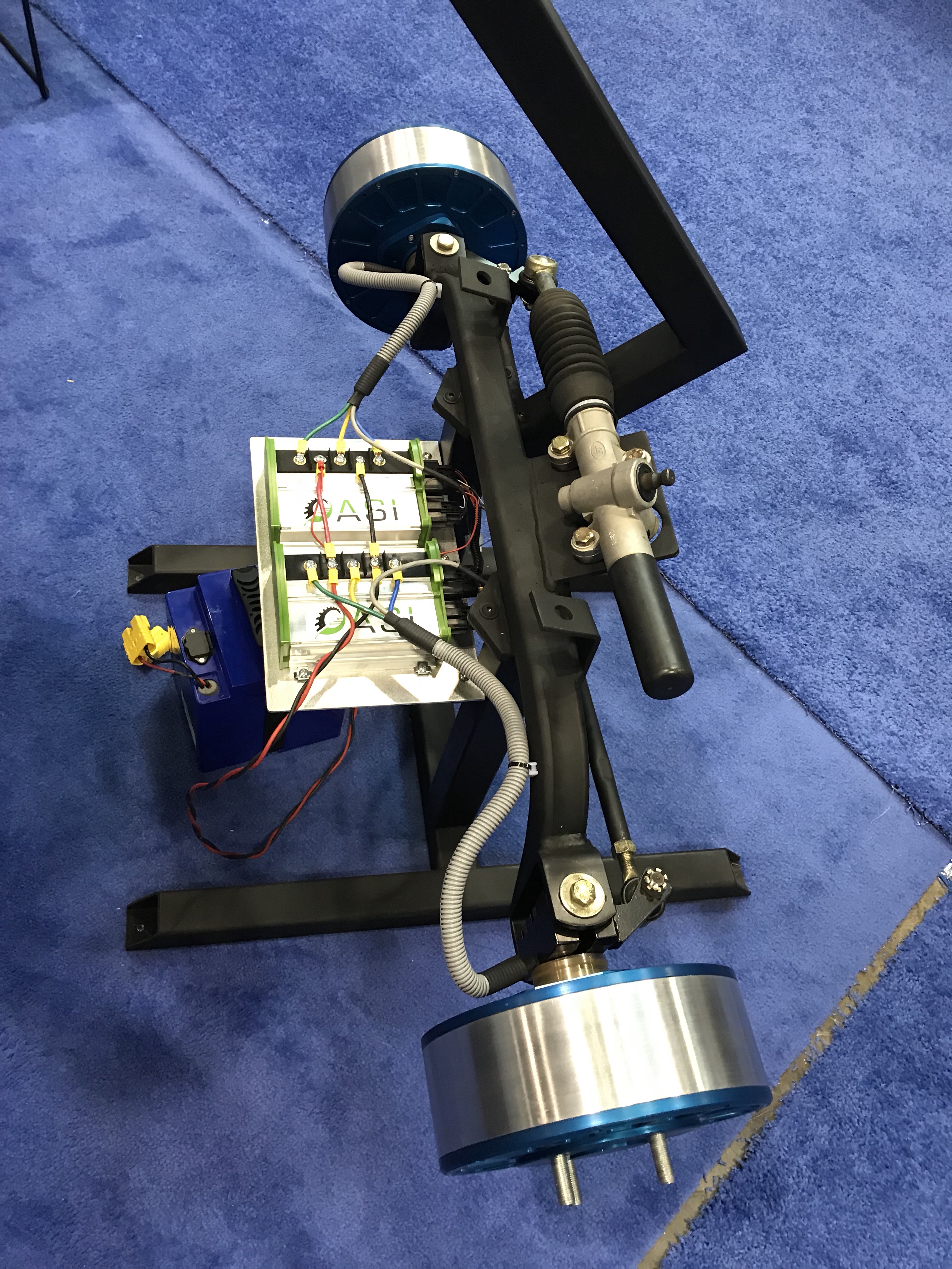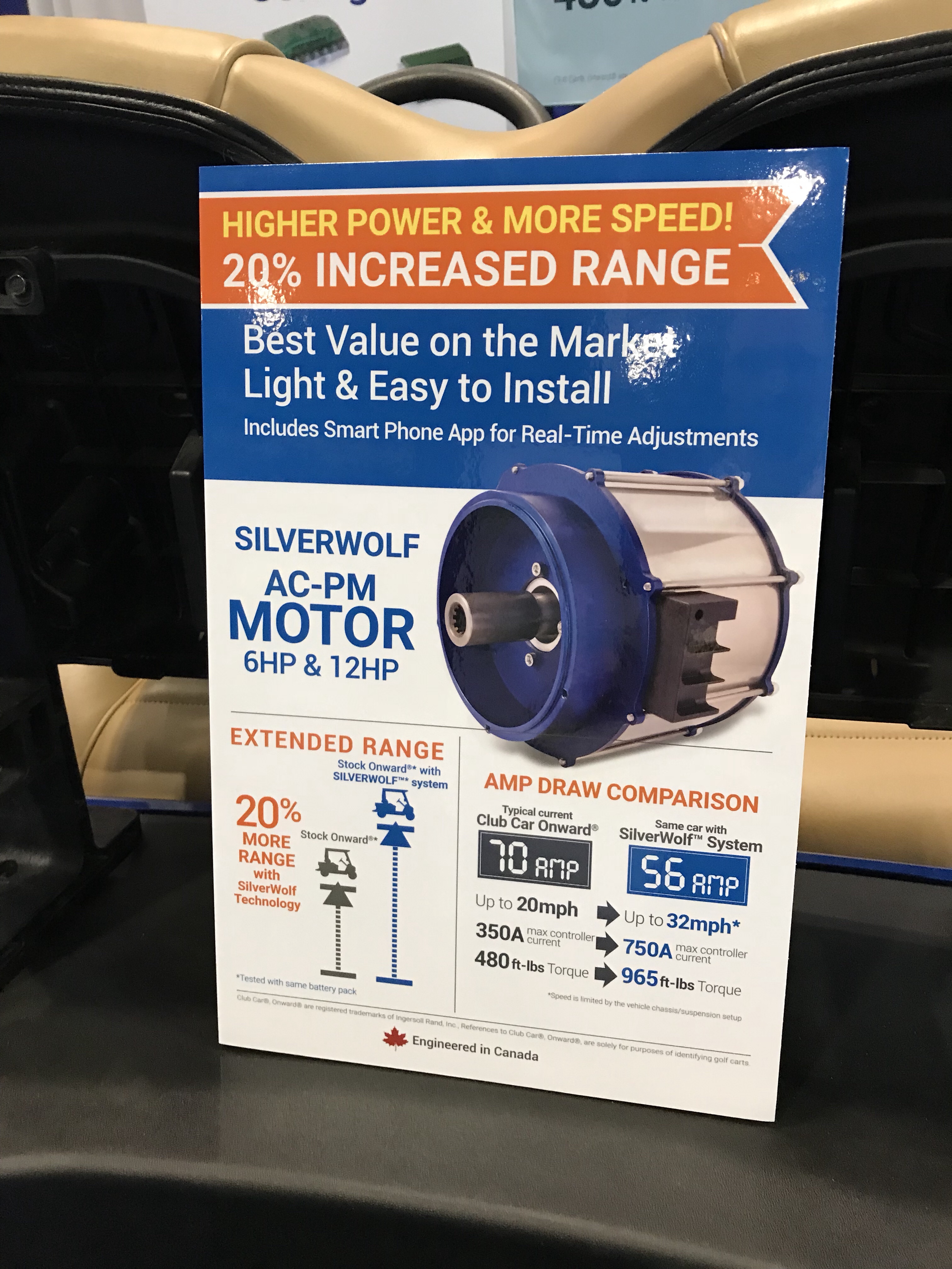Another interesting product that we came across at the trade show was Silver Wolf’s new DC to AC conversion kit. This conversion kit is designed to be sold as a motor controller upgrade kit. The model that they had on display was for a Club Car Precedent. Using their controller with the new AC motor, they can get a Club Car Precedent up to 19 miles an hour. When using an EAC motor, you can use unlock codes by a Bluetooth connection into the controller. This allows you unlock even greater speed, such as 24 and even 32+ miles an hour. These upgrades, however, would be offered at additional cost to the end-user. Initial projected dealer cost on this unit would be around $800 with the unlock from 19 to 24 miles an hour being between $100 to $200, then another step for the unlock for 24-32 miles an hour. This product is currently in production and is expected to be rolled out in March 2018.